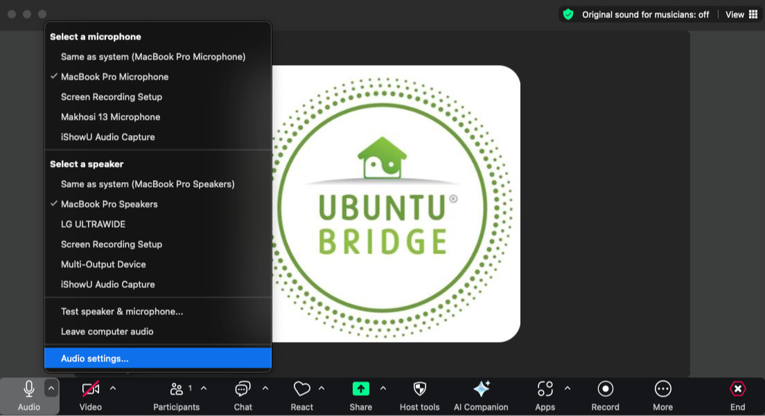 Look at top of screen when back in the class window where it says Original Sound for Musicians: off